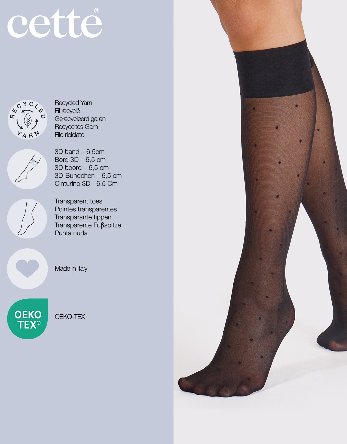 Właśnie dlatego stworzyliśmy te podkolanówki w kropki, wykonane z poliamidu pochodzącego z recyklingu, który jest pozyskiwany wyłącznie z surowców wtórnych, w sposób zrównoważony i przyjazny dla środowiska.
