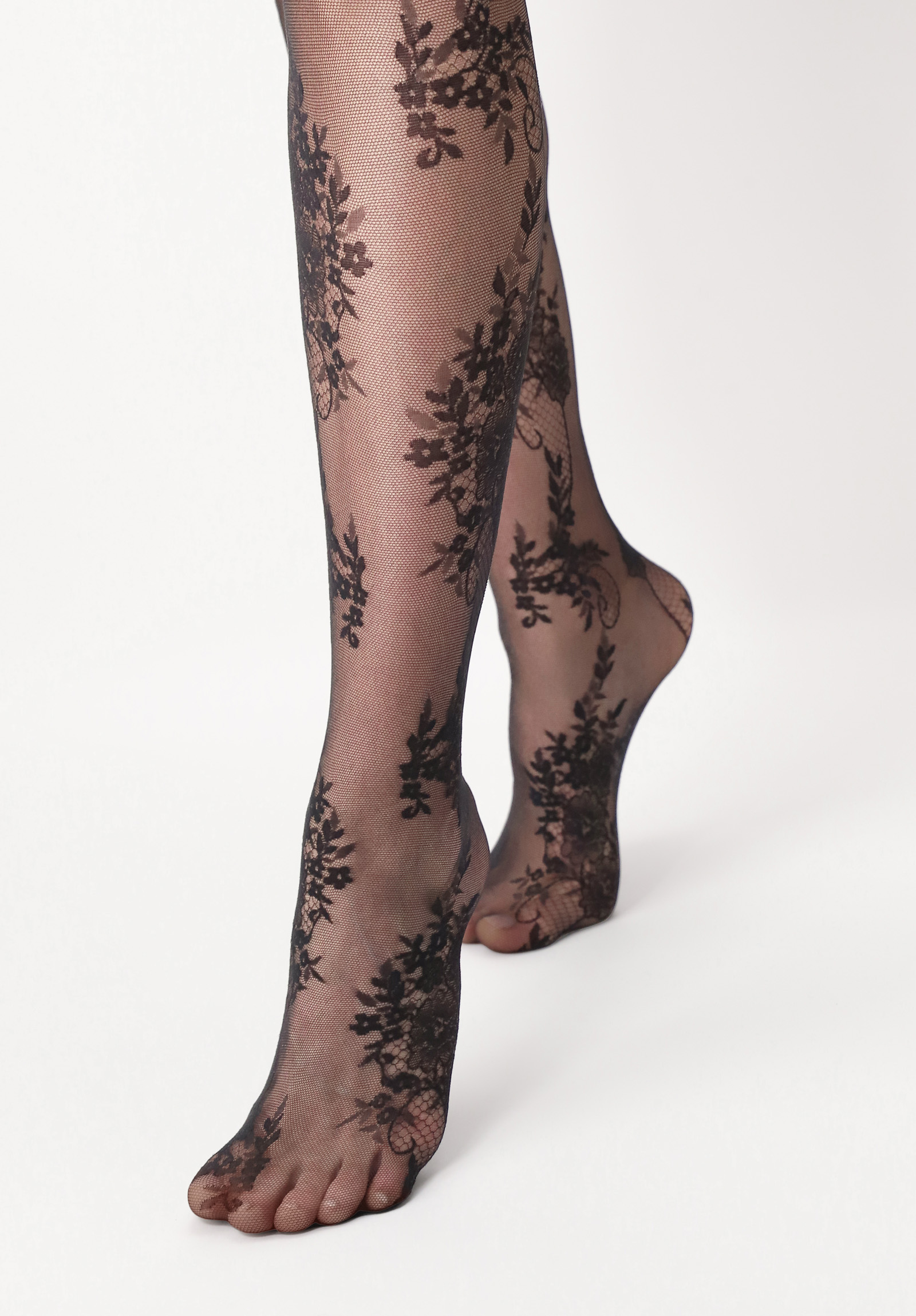 Dodaj odrobinę elegancji i kobiecości do swojej garderoby dzięki naszym przezroczystym rajstopom z efektem koronki, ozdobionym delikatnym motywem kwiatowym.