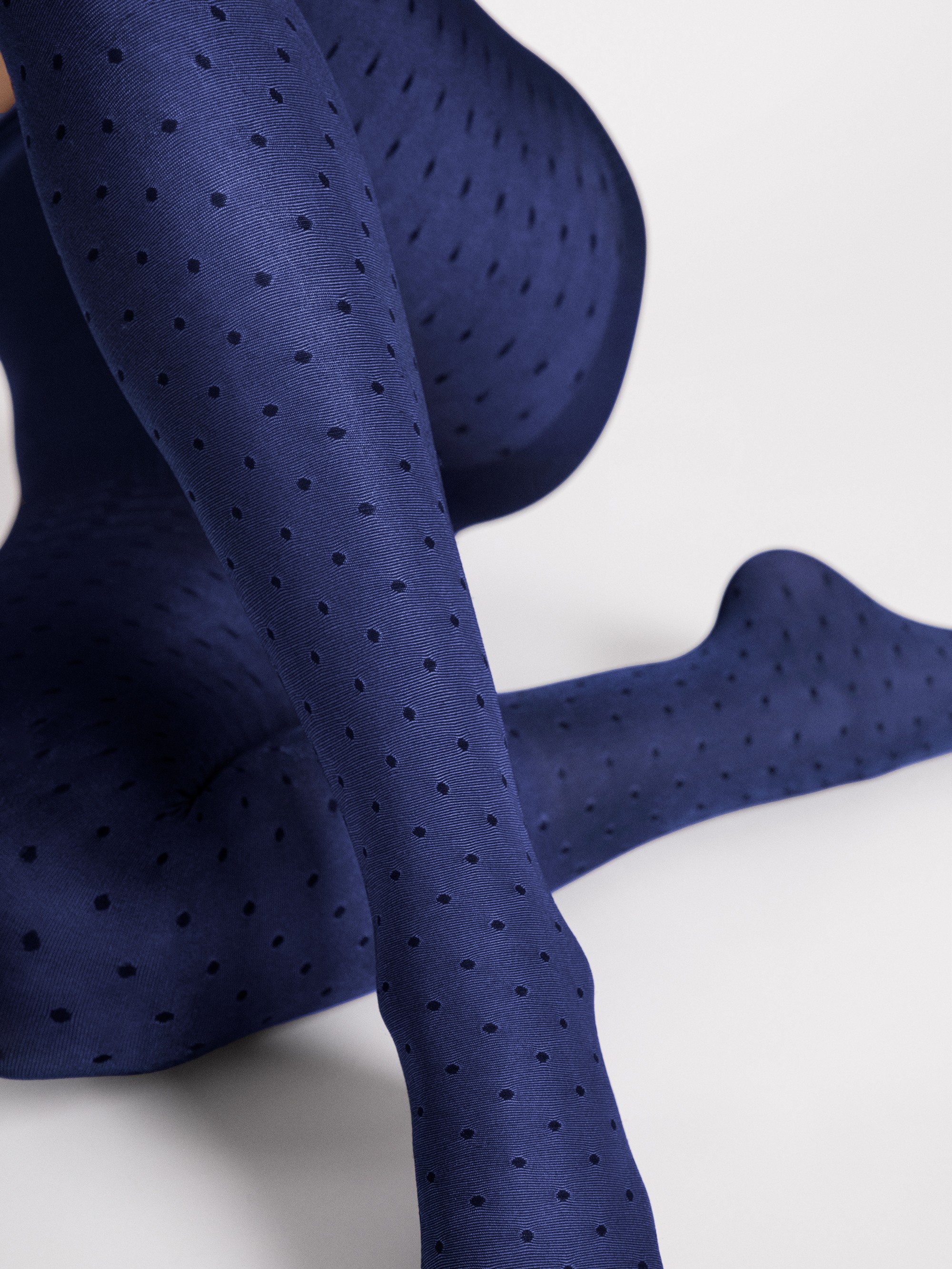 Czarujące niebieskie rajstopy w kropki, inspirowane delikatnymi pociągnięciami pasteli. Piękny odcień niebieskiego wywołuje poczucie spokoju i pogody ducha, a delikatne kropki dodają teksturze głębi. Niczym pudełko pastelowych kredek, te rajstopy oferują wszechstronność i nieograniczone możliwości stylizacji. Przykładowo połącz je z dowolną spódnicą i pastelową bluzką, aby uzyskać marzycielski i kobiecy wygląd.