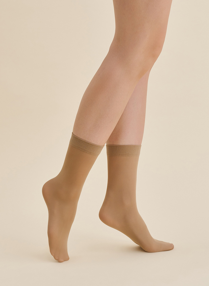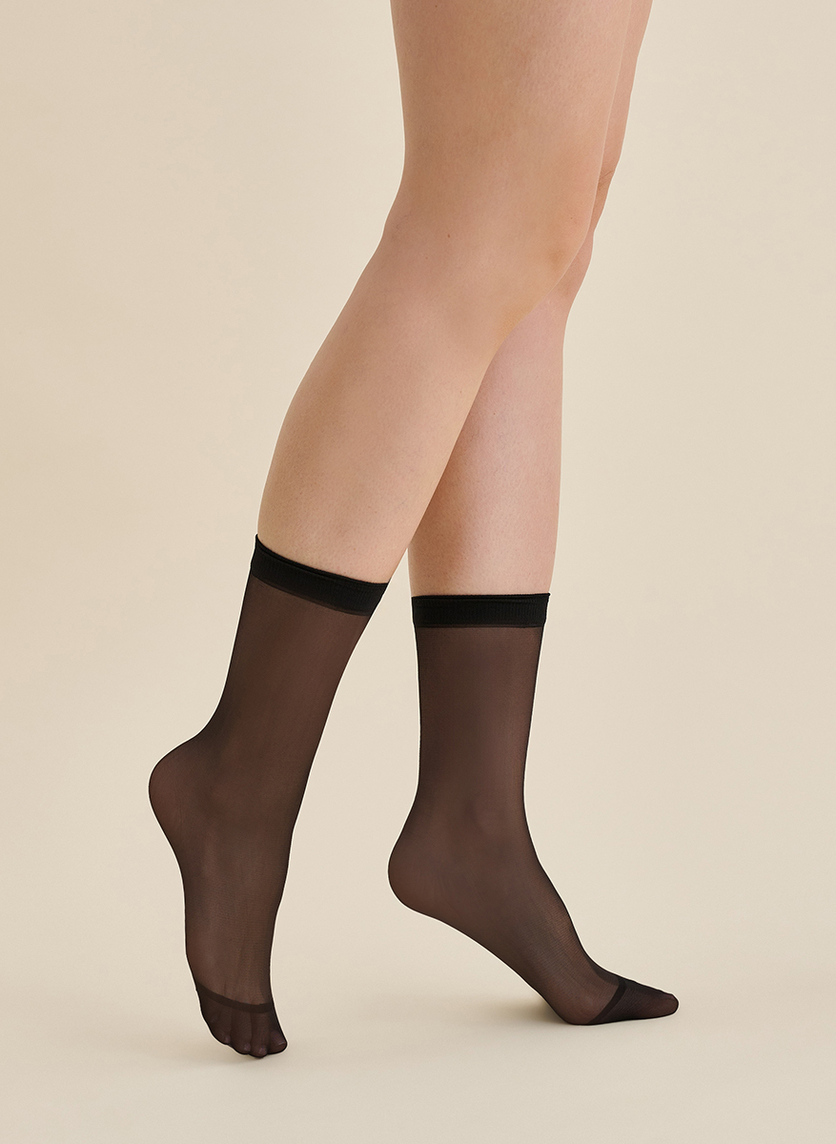 Skarpetki 15 DEN z włóknem LYCRA, z bezuciskowym ściągaczem i niewidocznym wzmocnieniem części palcowej.