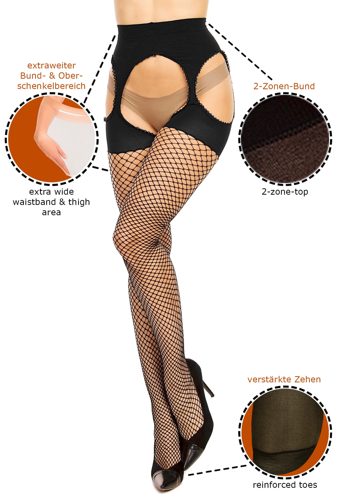 Rajstopy kabaretki imitujące pończochy z paskiem w dużych rozmiarach. Wygodne i łatwe w noszeniu jak zwykłe rajstopy, zmysłowe jak pończochy z paskiem! Specjalna, szeroka część majtkowa i wzmocniona część palcowa zapewniają doskonały komfort noszenia.