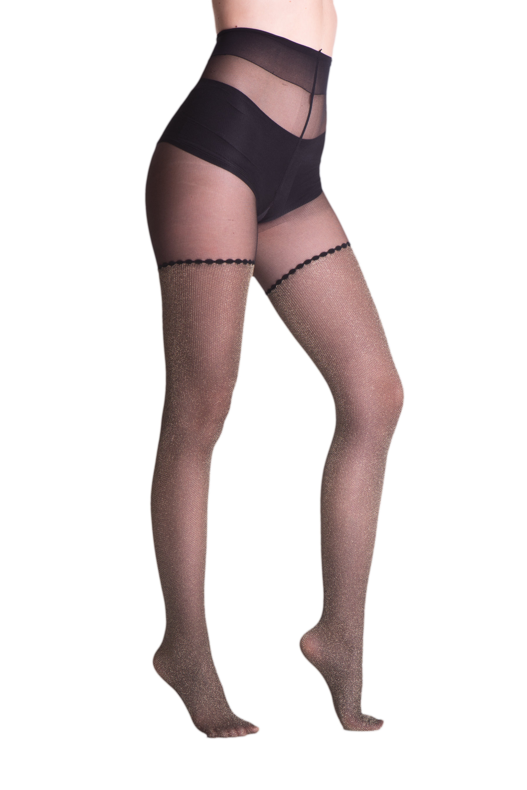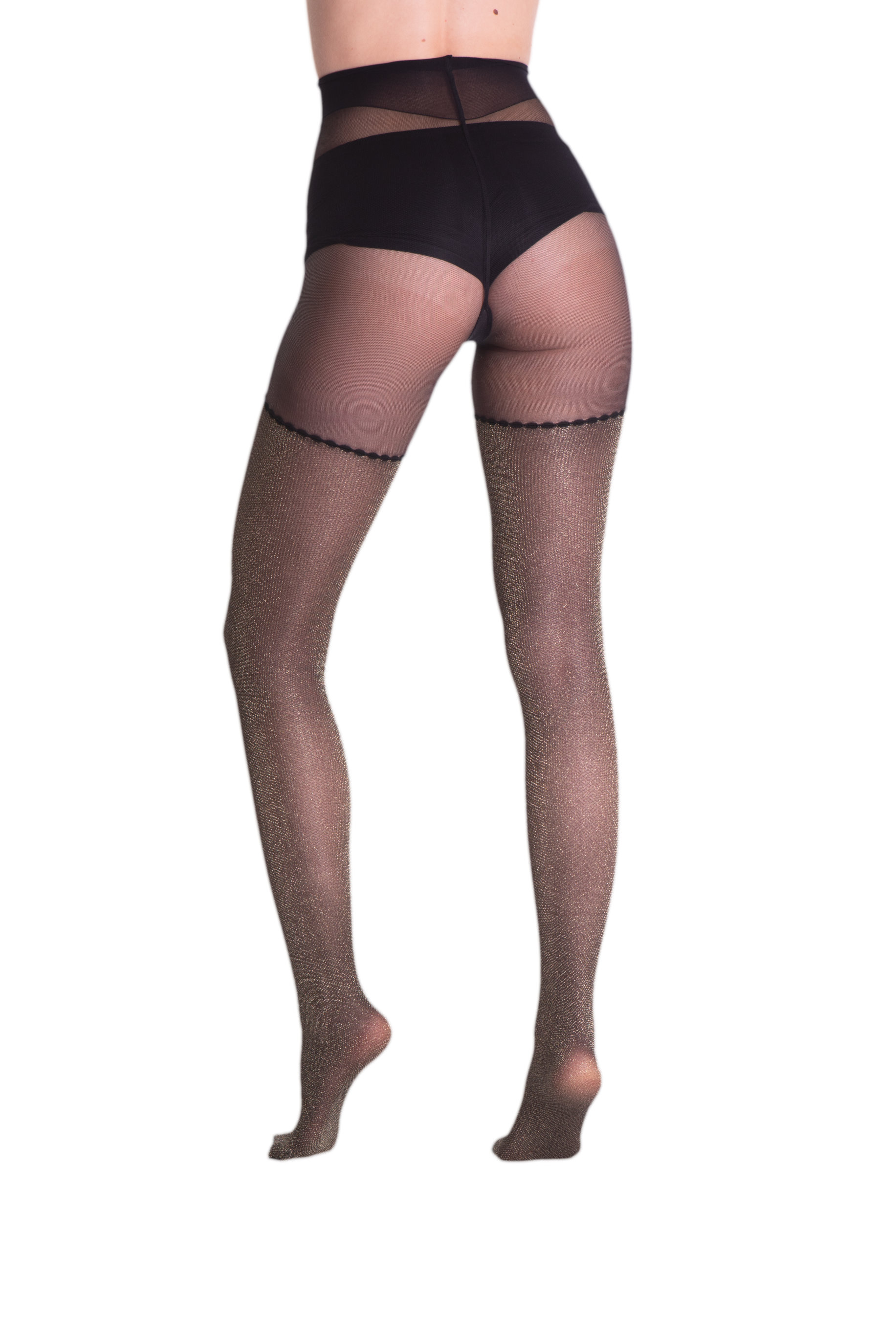 Ekskluzywne rajstopy ze wzorem imitującym pończochy z metalicznym połyskiem w kolorze złotym lub...węcej